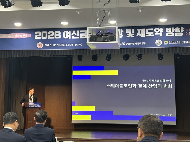 15일 유창우 비자코리아 전무가 '2026 여신금융업 전망 및 재도약 방향' 포럼에서 '스테이블코인과 결제 산업의 변화'를 주제로 발표를 하고 있다. [사진=더밸류뉴스]