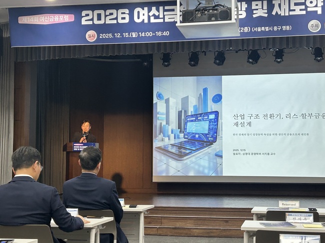 15일 서지용 상명대 교수가 '2026 여신금융업 전망 및 재도약 방향' 포럼에서 '산업 구조 전환기, 할부·리스금융 재설계'를 주제로 발표하고 있다. [사진=더밸류뉴스]