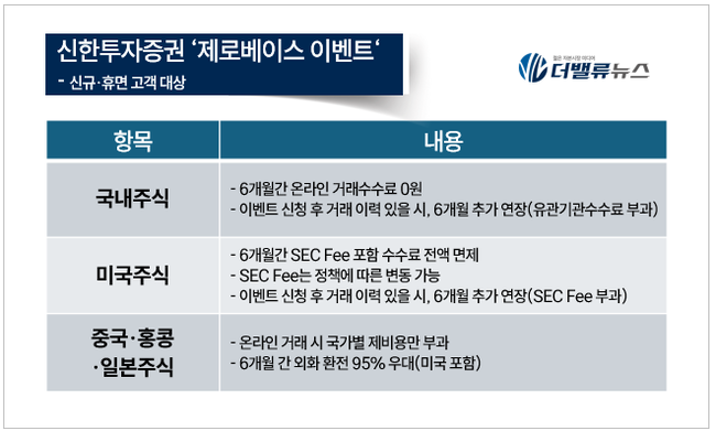 신한투자증권이 7월 1일부터 6개월간 '국내주식도! 미국주식도! 온라인 거래수수료 제로베이스 이벤트'를 진행한다. [자료=더밸류뉴스]