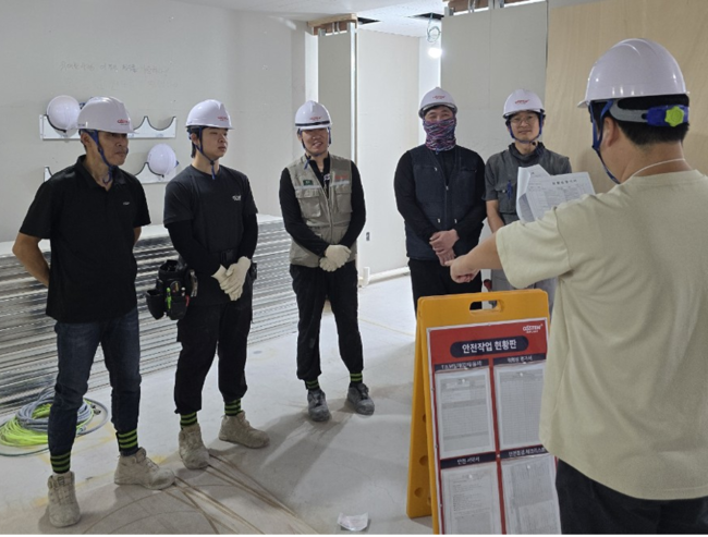 오스템임플란트 인테리어 시공팀이 현장 작업 전 안전 교육을 하고 있다. [사진=오스템임플란트]