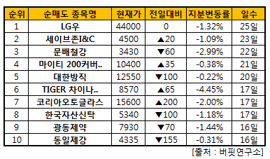 [버핏연구소=신현숙 기자] 5일 코스피 시장에서 기관의 연속 순매도 상위 5개 종목은 LG우(003555), 세이브존I&C(067830), 문배철강(008420), 마이티 200커버..(292340), 대한방직(001070)이다.