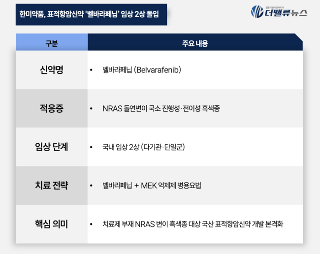 한미약품 표적 항암신약 '벨바라페닙' 국내 임상 2상 착수 주요 내용 요약 도표. [자료=더밸류뉴스]이번 임상 2상은 NRAS 돌연변이를 보유한 국소 진행성 또는 전이성 흑색종 환자를 대상으로, 벨바라페닙과 MEK 억제제 코비메티닙의 병용요법에 대한 유효성과 안전성을 평가하는 다기관·단일군 시험으로 진행된다.