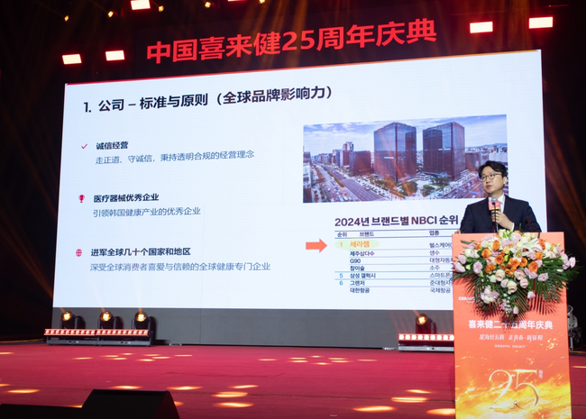 이경수 세라젬 대표가 지난 28일 중국 법인 설립 25주년 기념식에서 발표를 진행하고 있다. [사진=세라젬]