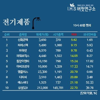 [버핏연구소=김승범 기자] 29일 오전 10시 40분 현재 전기제품 기업 가운데 PER(주가수익비율)가 가장 낮은 종목은 신화콘텍(187270)(5.62배)이다. 이어 피에스텍(002230)(9.15배), 파워넷(037030)(9.78배), 파워로직스(047310)(14.05배)가 뒤를 이었다.