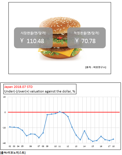 이는 7월 일본의 빅맥지수가 3.9달러, 미국의 빅맥지수가 5.51달러인 것을 바탕으로 산정한 것이다.