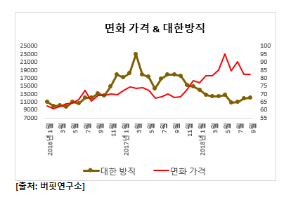상관관계는 두 변수가 동일하게 움직이는 것을 1.0으로 볼 때, 한 변수의 변화가 다른 한 변수의 변화에 미치는 정도를 나타내는 지수로, 0.5 이상이면 유의미한 상관관계가 있음을 나타낸다. 그러나 2017년 11월부터 면화 가격이 상승하면 대한방직의 주가가 하락하는 경향을 나타내고 있다.