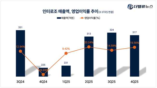 인터로조(대표이사 노시철)가 지난해 4분기 실적으로 연결기준 매출액 317억원, 영업이익 62억원을 기록했다고 지난 6일 공시했다(K-IFRS 연결). 전년동기대비 매출액은 33.3% 증가했고, 영업이익은 흑자전환했다.
