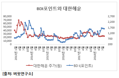 최근 10년간 BDI지수와 대한해운 주가의 상관관계(correlation coefficient)는 +0.908이다. 대한해운은 BDI지수가 상승하면 대한해운 주가 상승에 큰 영향을 미친다고 볼 수 있다.