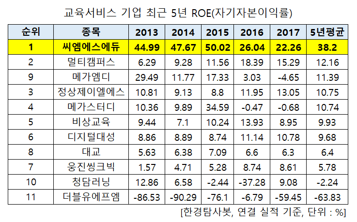 한경탐사봇이 교육서비스 기업들의 2013~2017년 실적을 바탕으로 ROE(자기자본이익률)를 조사한 결과 5년 평균 ROE 1위는 씨엠에스에듀(225330)(38.2%)였다. 이어 멀티캠퍼스(067280)(12.16%), 메가엠디(133750)(11.39%), 정상제이엘에스(040420)(10.75%), 메가스터디(072870)(10.74%), 비상교육(100220)(9.93%), 디지털대성(068930)(9.68%), 대교(019680)(6.4%), 웅진씽크빅(095720)(5.78%)이 뒤를 이었다.