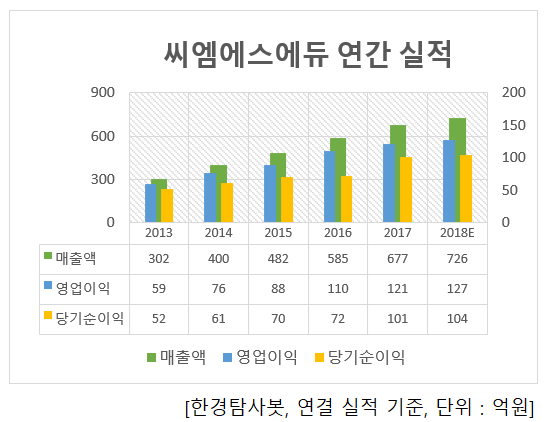 씨엠에스에듀의 실적은 지속적으로 개선되고 있다. 최근 5년간 매출액, 영업이익, 당기순이익이 모두 증가했다. 5년간 매출액은 연평균 22.51%, 영업이익은 19.9%, 당기순이익은 18.8% 증가했다. 올해도 개선세를 이어 갈 것으로 보인다. 추정 실적은 매출액 726억원, 영업이익 127억원, 당기순이익 104억원으로 전년비 각각 7.24%, 4.96%, 2.97% 증가가 기대된다.