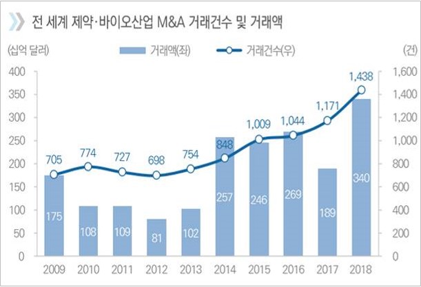 지난해 전세계 바이오·제약 업계의 M&A(인수합병) 규모를 조사한 결과 400조원에 달하는 것으로 조사됐다. 이는 최근 10년간 최대 규모이다. 한국의 거래 건수 기준 순위는 11위로 전년과 동일한 순위를 기록했다.