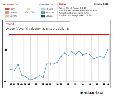 영국 경제전문지 이코노미스트의 「1월 빅맥지수(Big Mac Index)」 를 바탕으로 산출한 위안/달러 적정 환율(Implied Exchange Rate)은 3.86위안인 것으로 나타났다.