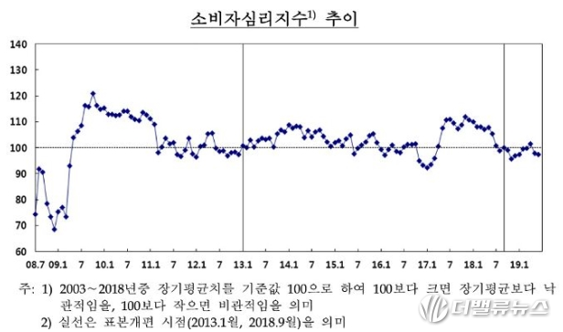 25일 한국은행의 '2019년 6월 소비자 동향조사 결과'에 따르면 이달 소비자심리지수(CCSI)는 97.5으로 전월비 0.4포인트 하락했다.