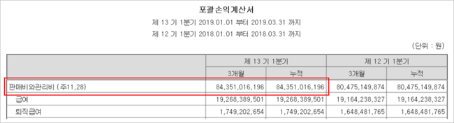자유롭게 쓸 수 있는 현금이 260억원인데, 이 회사에서 임직원 급여를 비롯해 고정적으로 빠져나가는 금액은 얼마일까? 이를 회계상으로는 '판매비와 관리비'라고 하는데, 1분기 손익계산서를 살펴보면 843억원이다. 월평균으로 환산하면 281억원이다.