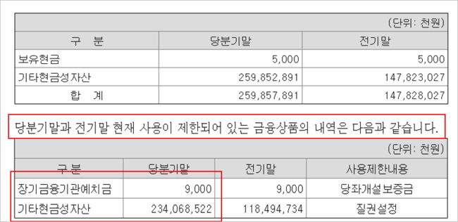 웅진씽크빅의 현금사용제한 내역. K-IFRS 1분기 별도 재무제표 기준. 단위 1000원. [자료=금융감독원 전자공시]