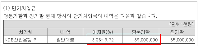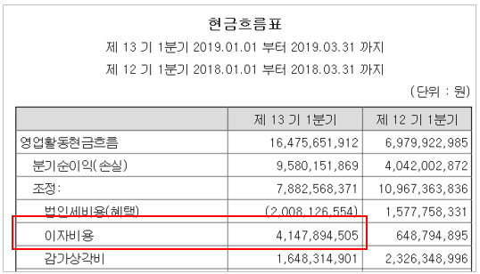 단기차입금에 대한 이자비용으로 이 회사는 지난 1분기(1~3월)에 41억원을 지출했다. 월 단위로 환산하면 현금 14억원이다.