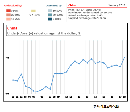 영국 경제전문지 이코노미스트의 「1월 빅맥지수(Big Mac Index)」 를 바탕으로 산출한 위안/달러 적정 환율(Implied Exchange Rate)은 3.86위안인 것으로 나타났다.