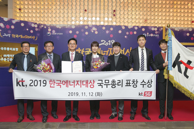 KT가 12일 서울 여의도 63컨벤션센터에서 열린 ‘2019 한국에너지 대상’에서 국무총리 표창을 수상했다고 밝혔다.