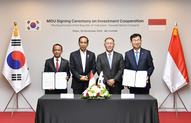 현대자동차는 26일 오후 현대차 울산공장에서 조코 위도도(Joko Widodo) 인도네시아 대통령, 정의선 현대자동차그룹 수석부회장 등이 참석한 가운데 인도네시아 정부와 현지 공장 건설을 위한 투자협약을 체결했다고 밝혔다.