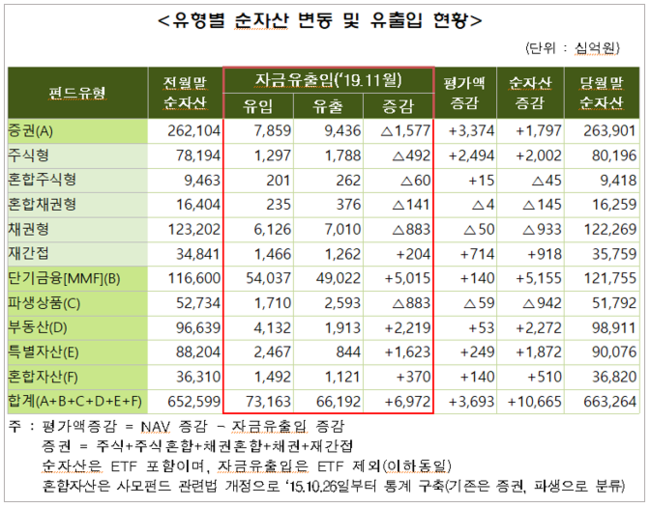 유형별 순자산 변동 및 유출입 현황. [사진=금융투자협회]