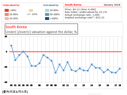 이코노미스트에 따르면 원/달러 환율은 2003년 이후 저평가 구간에 진입해 있다.