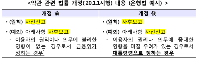 기존 금융서비스와 상당한 차별성이 있는 내용은 사전신고 대상으로 남겨뒀다. 아직 출시된 적이 없어 예상하지 못한 소비자의 피해 발생 가능성이 있다는 점을 고려한 조치다. 이용자의 권리를 축소하거나 의무를 확대하기 위한 약관 개정 역시 사전신고 대상이다. 특히 불리한 약관을 기존 이용자에게 적용하려면 사전에 당국과 조율을 거쳐야 한다.