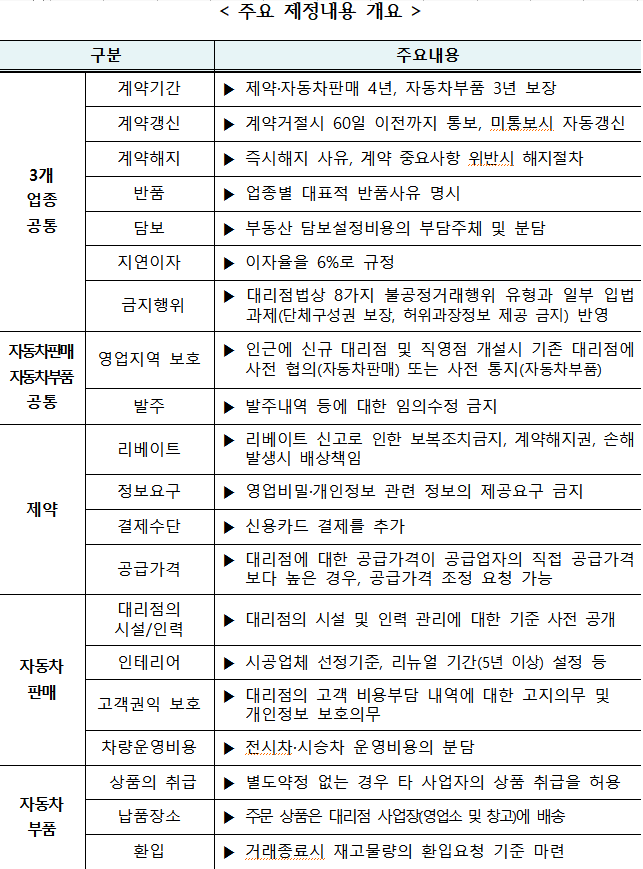 불공정거래 경험 비율이 상대적으로 높았던 자동차판매 업종은 대리점을 상대로 한 공급업자의 과도한 경영 간섭을 제한했다. 앞서 공정위 실태조사 결과 자동차판매 대리점의 28.1%가 공급업자로부터 직원 인사 개입 등 경영간섭을 경험한 것으로 나타났다.