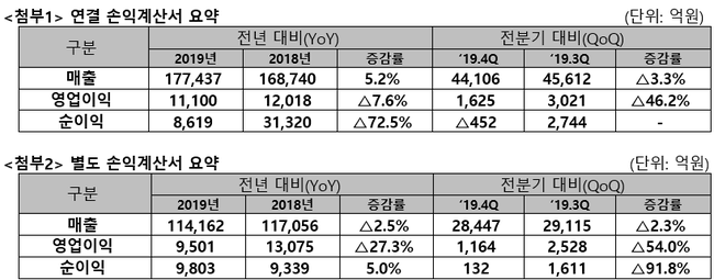 SK텔레콤의 별도 기준 연간 매출은 선택약정할인 가입자 증가 등의 영향으로 전년 대비 2.5% 감소한 11조4162억원을 기록했다. SK텔레콤은 "데이터 사용량 증가, 5G 가입자 증가 추세에 힘입어 작년 2분기부터 이동전화 매출 상승세가 지속되고 있어 올해는 반등이 기대된다"고 밝혔다.