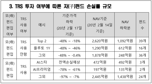 모펀드와 함께 다른 자산을 편입한 자펀드의 경우에는 모펀드 기준가격 조정과 다른 개별 자산의 기준가격 조정을 같이 반영하게 되고, 이 가운데 TRS를 사용한 자펀드는 역시 레버리지 비율이 추가돼 손실이 더 커진다.