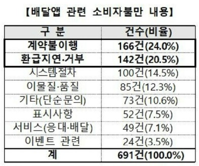 구체적으로 미배달, 오배달 등 계약 불이행 관련 불만이 166건(24%)으로 가장 많았다. 이어 환급지연‧거부가 142건(20.5%), 전산시스템 오류, 취소 절차 등과 관련된 불만은 100건(14.5%)이었다.