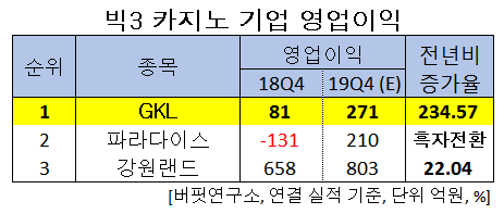 한국 주식 시장의 3대 카지노 관련주 가운데 지난해 4분기 영업이익 증가율 1위는 GKL(대표이사 사장 유태열)로 조사됐다.