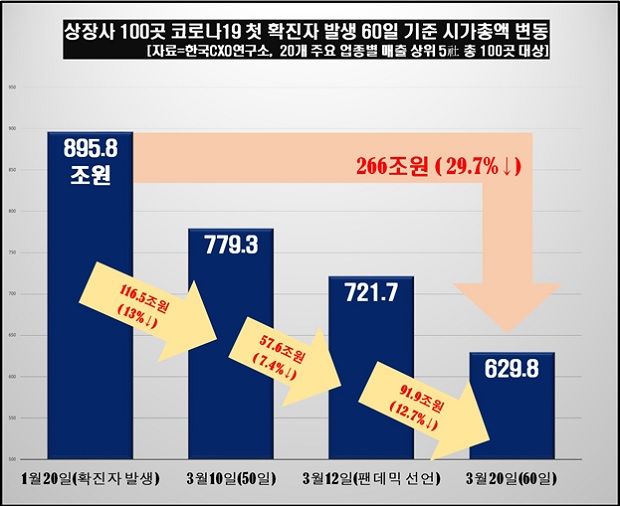 23일 기업분석 전문 한국CXO연구소의 ‘국내 주요 상장사 100곳의 코로나19 첫 확진자 발생일 대비 60일 기준 주가 및 시가총액 변동 분석’에 따르면 국내 20개 업종 100개 상장사 시가총액은 629조원으로 국내 첫 확진자가 발생한 지난 1월 20일(859조원)보다 29.7% 감소했다.