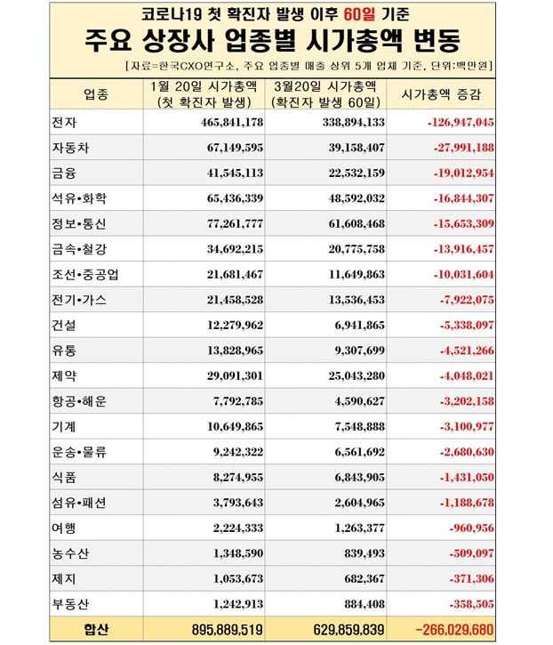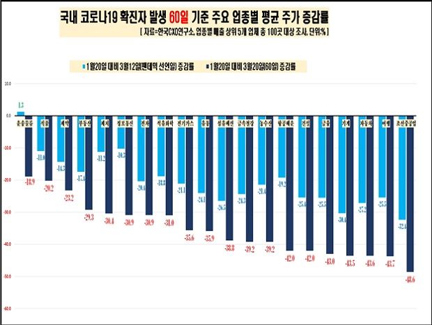 코로나19 첫 확진자 발생 이후 60일 기준 주요 상장사 업종별 시가총액 변동. [사진=더밸류뉴스(한국CXO연구소 제공)]