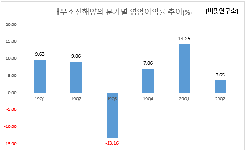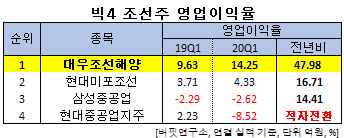 버핏연구소의 조사에 따르면 대우조선해양의 올해 1분기 영업이익률은 14.25%로 전년비 47.98% 증가했다.