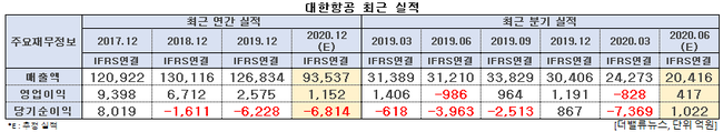 대한항공 최근 실적. [사진=더밸류뉴스]