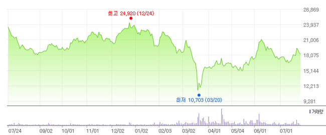 대한항공은 지난해 12월 24일 52주 신고가(2만4920원)를 갱신했으나 올해 초 신종 코로나 바이러스 감염증(코로나19) 여파로 3월 20일에는 52주 신저가(1만703원)를 기록했다.