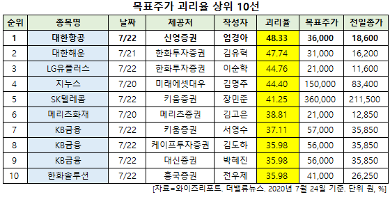 최근 증권사에서 발표된 종목 가운데 대한항공의 목표주가 괴리율이 가장 높은 것으로 나타났다.