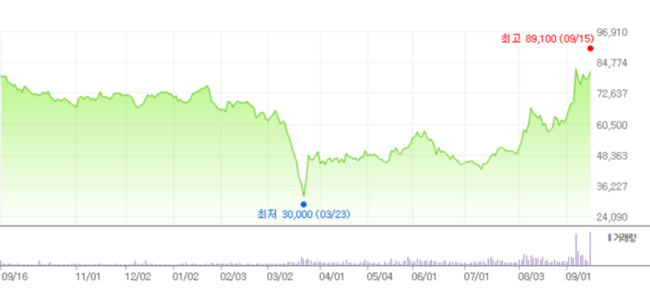 한국금융지주는 신종 코로나 바이러스 감염증(코로나19)으로 인해 3월 23일 52주 신저가(3만원)를 기록했다. 하지만 2분기 우수한 실적과 더불어 카카오게임즈(293490) IPO(기업공개) 흥행, 카카오뱅크 지분가치 기대감 등으로 15일 52주 신고가(8만9100원)를 기록했다.