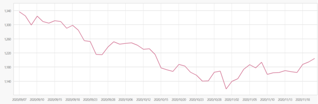 최근 3달간 KRX 게임 K-뉴딜지수 추이. [이미지=더밸류뉴스(한국거래소 제공)