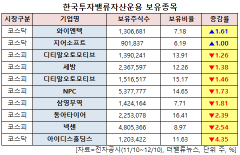 반면 아이디스홀딩스(054800)의 주식 비중을 15.98%에서 11.63%로 4.35%p 줄여 축소 폭이 가장 컸다. 이어 넥센(005720) 등에 대한 보유 지분을 축소했다.