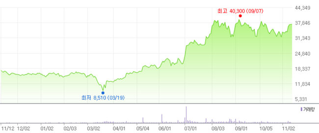 웹젠은 올해 초 신종 코로나 바이러스 감염증(코로나19) 여파로 3월 19일 52주 신저가(8510원)를 기록했다. 이후 신작게임이 흥행에 성공하면서 9월 7일 신고가(40300)를 갱신했다.