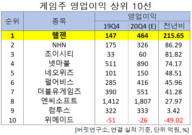 게임주 영업이익 상위 10선. [이미지=더밸류뉴스]