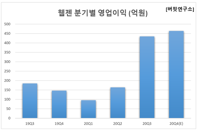버핏연구소의 분석 자료(기준일 12월 24일)에 따르면 웹젠의 올해 4분기 예상 영업이익은 464억원으로 전년비 215.65% 증가할 것으로 예상된다.