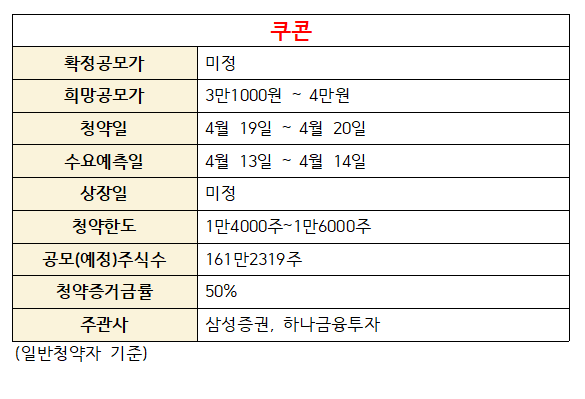 비즈니스 데이터 기업 쿠콘은 다음달 말 코스닥 시장에 IPO 예정이며, 이를 위해 다음달 19~20일 이틀간 일반인을 대상으로 공모주 청약을 진행한다. 대표주간사는 하나금융투자, 공동주간사는 삼성증권이다.