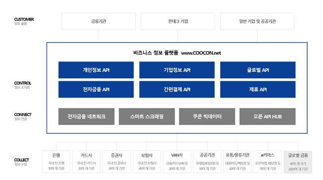 쿠콘은 비즈니스 데이터를 가공해 은행, 증권사를 비롯한 금융기업과 KT, SK텔레콤을 비롯한 대기업에 제공한다. 예를 들어 직장인 A씨가 스마트폰으로 요금 결제를 할 때 통신사가 A씨의 개인정보를 확인토록 돕는 업무를 쿠콘은 수행한다. 쿠콘측은 "40여 국가, 2500여 기관으로부터 수집 연결하는 5만여 정보와 지급결제 서비스를 국내 최대 정보 플랫폼 '쿠콘닷넷'을 통해 200여 종의 API(application programming interface. 맞춤형 프로그램 장치) 상품으로 제공하고 있다"고 밝히고 있다. 정보화 사회가 도래하면서 비즈니스 데이터 수요가 폭발적으로 증가하고 있다는 것은 우리 주변을 살펴보면 쉽게 확인되고 있다.