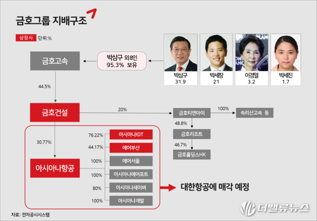 아시아나항공 경영권이 넘아가면 금호아시아나그룹의 계열사로는 금호건설, 금호고속, 금호티앤아이, 금호리조트 등이 남게 되고, 재계 순위는 22위에서 60위권으로 축소된다. 그룹명에서 '아시아나'도 빼야 한다. 코로나19 이전 시기인 2019년 아시아나항공 매출액은 6조8868억원으로 그룹 전체 매출액의 70% 가량을 차지했다.