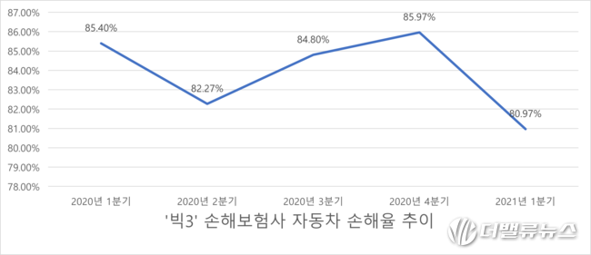 '빅3' 손해보험사 자동차 손해율 추이. [이미지=더밸류뉴스]