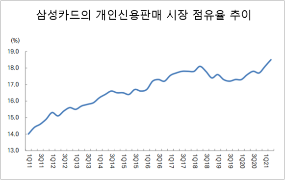 삼성카드의 레버리지 비율이 건전하다는 것은 그만큼 일반 소비자를 대상으로 대출 레버리지를 일으켜 실적을 개선할 수 있다는 의미를 갖고 있다. 올 들어 삼성카드의 개인신판 시장점유율은 증가세다. 1분기 18.1%, 2분기 18.5%로 증가한 데 이어 3분기에도 18.8%까지 늘어날 것으로 전망된다. 2019년 5월 코스트코 독점 계약이 종결 여파로 그 해 3분기 개인신판 점유율이 17.2%까지 빠졌었지만, 빠르게 저점을 찍고 이후로는 꾸준히 상승하고 있다. 삼성카드는 삼성그룹 계열 금융사이자 국내 유일의 카드상장사이다.