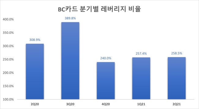 기업분석전문 버핏연구소 조사에 따르면 BC카드의 올해 상반기 레버리지비율은 258.45%로 1위를 기록했다. 이어 삼성카드(029780)(346.79%), JT캐피탈(376.17%), 하나카드(473.69%), DB캐피탈(476.07%) 순이다.