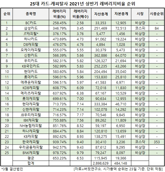 올해 2분기 기준 '25대 카드∙캐피탈사'의 평균 레버리지비율은 653.23%이고 평균 자산총계는 11조5945억원 평균 자본총계는 1조9366억원이다.